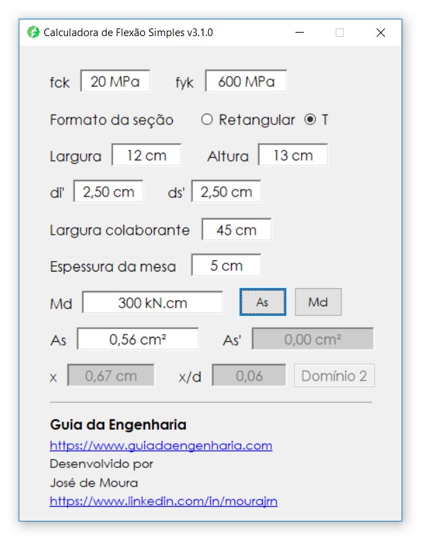 Boa noite, ótimo conteúdo. Verifiquem o cálculo da área da seção T, (0,45*0,05)+(0,08*0,12) dá 0,0321m2 e não 0,0123m2